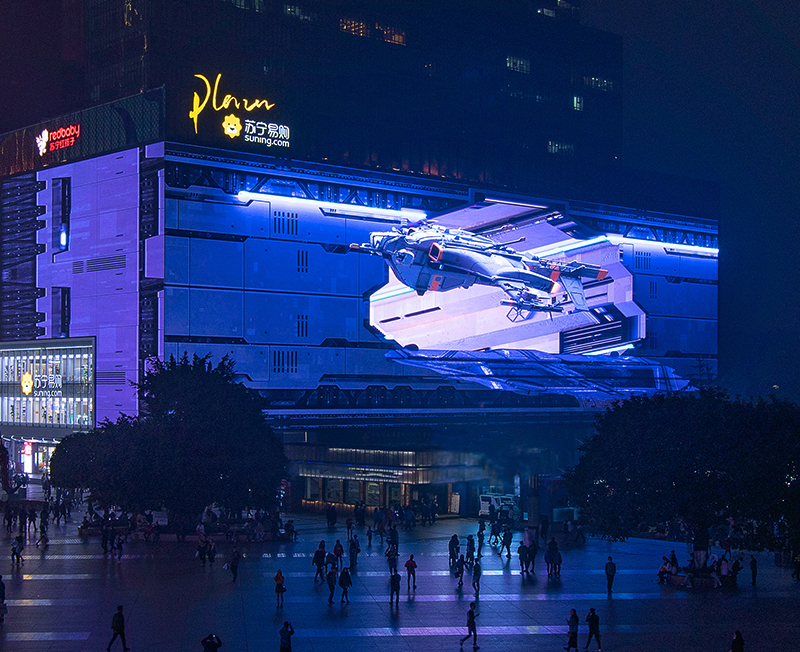 1.成都太古里裸眼3D案例,如科幻世界的飛船就在眼前,讓成都太古里商圈的巨大屏幕火爆全網(wǎng)。去年黃金國(guó)慶假期,吸引了全國(guó)各地各地朋友前來(lái)拍照打卡。