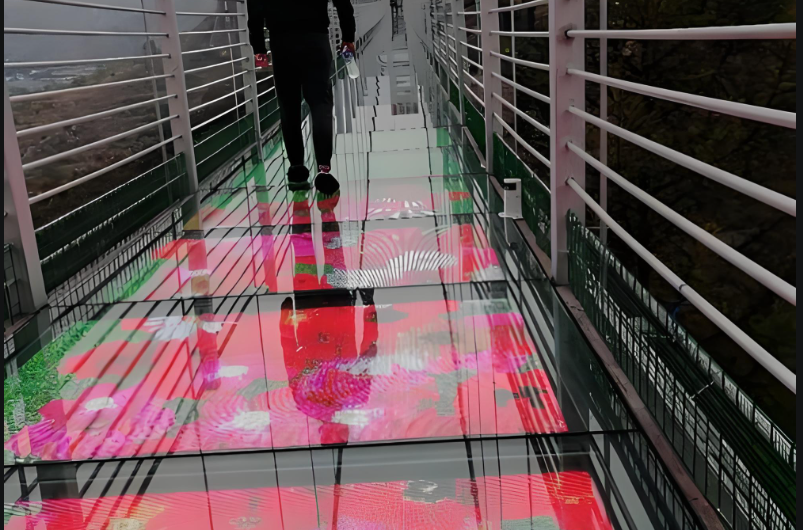隨著旅游產(chǎn)業(yè)的蓬勃發(fā)展,景區(qū)之間的競爭已從自然景觀延伸至技術(shù)創(chuàng)新體驗。近年來,玻璃棧道因其驚險刺激的特性成為眾多景區(qū)的“標配”設(shè)施,而其中LED顯示屏技術(shù)的融合應(yīng)用,更將這一體驗推向新高度。通過透明顯示、雷達感應(yīng)與音效系統(tǒng)的整合,玻璃棧道從單純的觀景平臺轉(zhuǎn)型為沉浸式互動體驗空間,不僅極大提升游客參與感,也為景區(qū)運營開辟了全新商業(yè)模式。