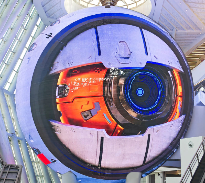 利亞德集團(tuán)打造的館內(nèi)中庭地球LED屏是館內(nèi)的核心區(qū)域,也是建筑外觀(guān)透明玻璃展示的一部分,象征宇宙天體。懸掛于空中的巨大球形屏幕上循環(huán)展現(xiàn)著地球、月球、火星等天體表面的模擬畫(huà)面,以及未來(lái)感十足的機(jī)械動(dòng)畫(huà),逼真的聲光電效果時(shí)常讓人驚艷。